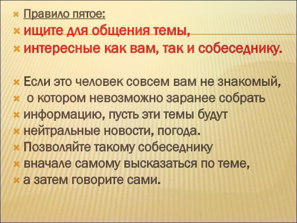 Никогда в разговоре с собеседником не врите. Не врите даже тогда, когда не хотите показаться дураком или глупым. Если собеседник увидит, что вы ему врете, ни о каком дальнейшем приятном общении и речи быть не может.Умение слушать