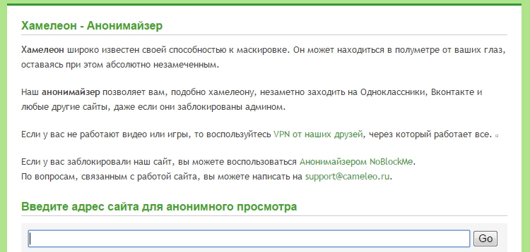 Первый способ — это использование специального сервиса — анонимайзера, благодаря которому осуществляется анонимный вход на сайт. Таким образом сайт не определяет, что пришел кто-то из России и спокойно пропускает его. Давайте я покажу как пользоваться таким сервисом, на примере анонимайзера «Хамелеон». Зайдите на сайт [urlspan]cameleo.ru[/urlspan] и в поисковой строке введите адрес нужного сайта, например тот же kinozal.tv. После этого нажмите Go и вас перекинет на нужный сайт.