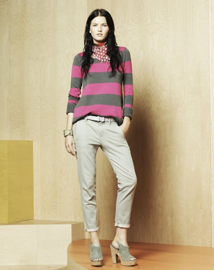 Следует избегать бледных оттенков чиносов, если у них завышена талия, лучше выбирать цвет ярче или темнее верха. Из принтов — мелкую контрастную клетку или сплошной цветочный мотив. По делам можно отправиться, заправив в чиносы легкую шифоновую или атласную блузу с напуском, надев лонгслив, водолазку, тонкий свитер. Из верхней одежды подойдет плащ или пальто до колена. А вот пиджаки и жакеты должны быть укороченными. Эффектно будет смотреться косуха.