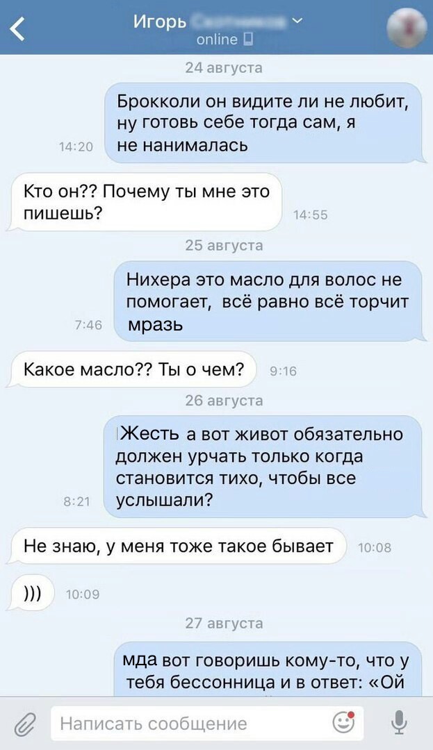Она сказала мне, что отключила этого бывшего, но после того, как мы стали эксклюзивными, она оставила свой телефон дома открытым, и я заметил, что на самом деле она не отключила его, и что этот бывший также побуждал ее избавиться от меня и вернуться к нему (хотя она не проявляла ко мне никакого интереса). Важно отметить, что я не искал эти сообщения — я как раз возвращал ей телефон, и они смотрели мне в лицо. У нас был спор по этому поводу, и в конце концов она призналась мне, что у нее проблемы с вниманием со стороны мужчин, когда она состоит в отношениях, и что у нее очень мало подруг. Она чувствует, что ей нужно держать этих бывших рядом, потому что они единственные ее друзья. Хотя она и сблизилась с моими друзьями и семьей, в каком-то смысле они «не в счет», потому что, если я уйду от нее, они перестанут быть ее друзьями или что-то в этом роде. Это была временная проблема и единственная реальная точка трения в наших отношениях.