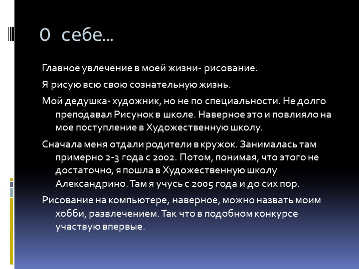 Будьте максимально кратки и лаконичны в своих высказываниях. Работодатель просто хочет немного узнать о вас, и подробное жизненное описание тут ни к чему. Ваш ответ должен занимать буквально пару минут. Приведите 2-3 интересных факта, которые максимально хорошо характеризуют вас. Именно поэтому следует заранее обдумать ваш рассказ.