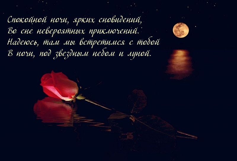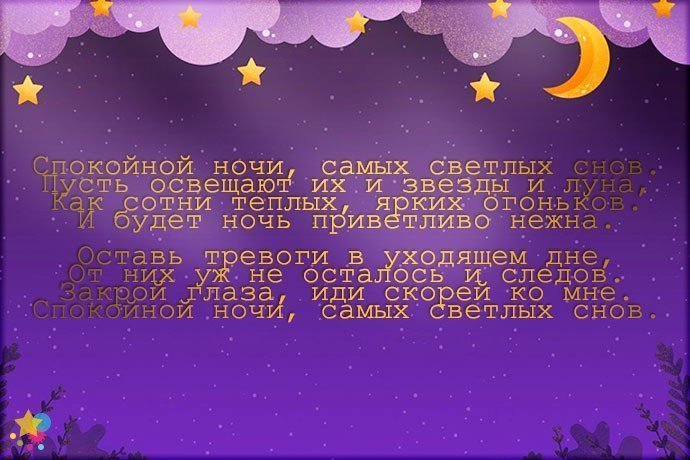 Доброй сладкой ночи! Пусть твоя подушка будет мягкой, а одеяло — тёплым. Пусть все звёзды и луна охраняют твой сон, заберут твои тревоги, пусть тебе приснятся самые добрые и волшебные сновидения, которые смогут зарядить тебя энергией и позитивом на весь следующий день.