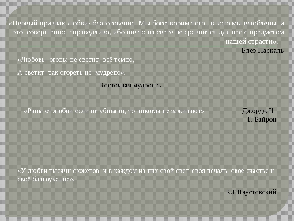 Речь не идет о полном безразличии к остальному миру, просто отпала необходимость в постоянном поиске другого, в привлечении чьего-то внимания к себе. Найденный им объект симпатии настолько глубокий и бескрайний, что не хочется размениваться на остальных.