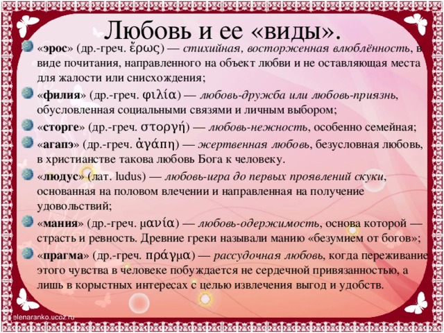 В страсти человек получает радость, а не печаль, тревогу, ревность или страх потерять важного человека. То, что изменяет наш мир, что так многогранно и многолико. Однако можно выделить некоторые общие основные черты, свойственные этому великому чувству.