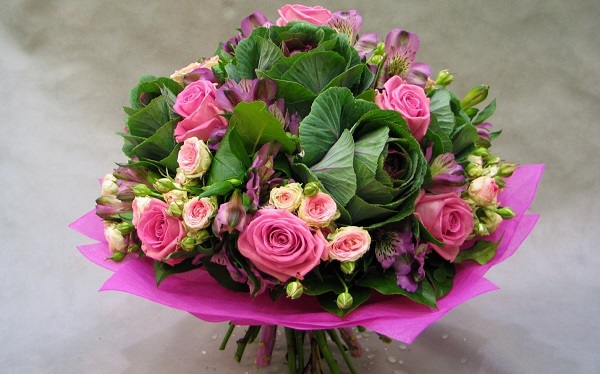 - Для создания грамотной связки выбирают не более 3 разновидностей цветов и обязательно немного зелени.