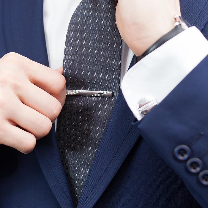 Зажим для галстука используется для пристегивания галстука к рубашке, чтобы галстук не раскачивался и чтобы он свисал прямо.