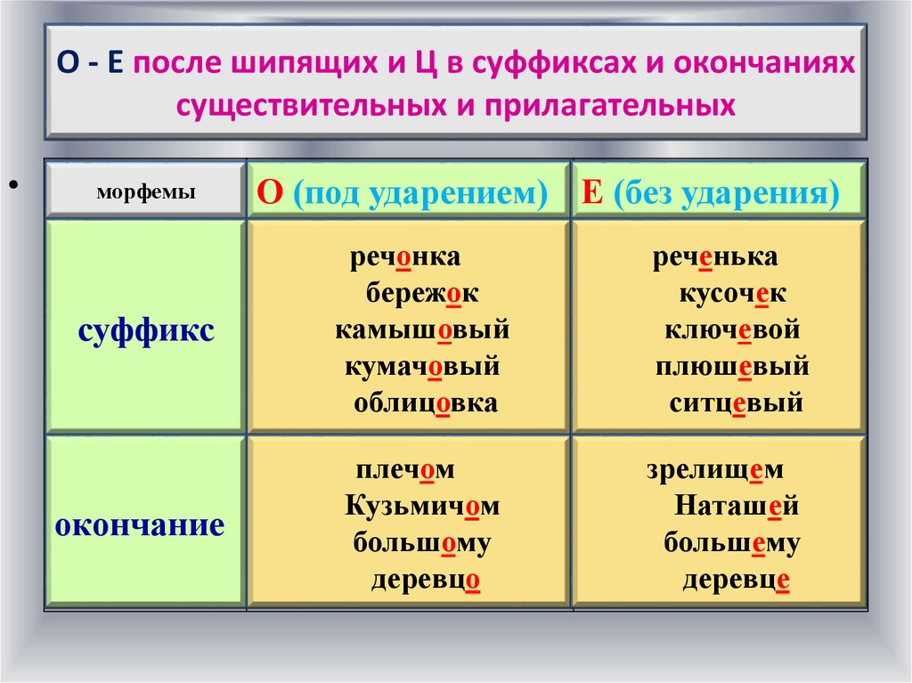 В окончаниях после шипящих под ударением (в именах существительных, а также прилагательных) всегда пишется буква «о». Для наглядности приведем несколько примеров: