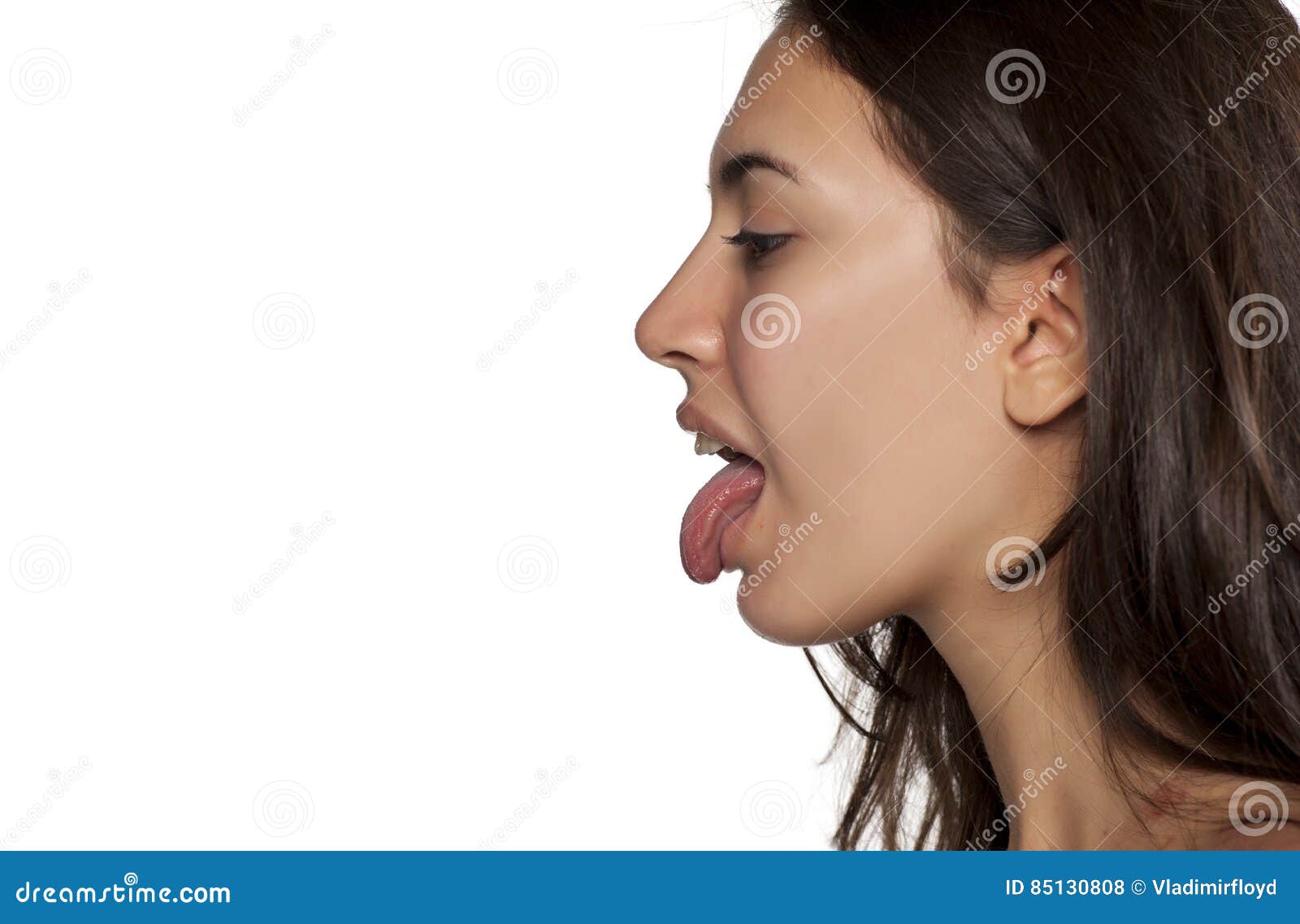 Высовывает язык. женщина обрезанный вид высунуть чистый язык изо ртаPREMIUM