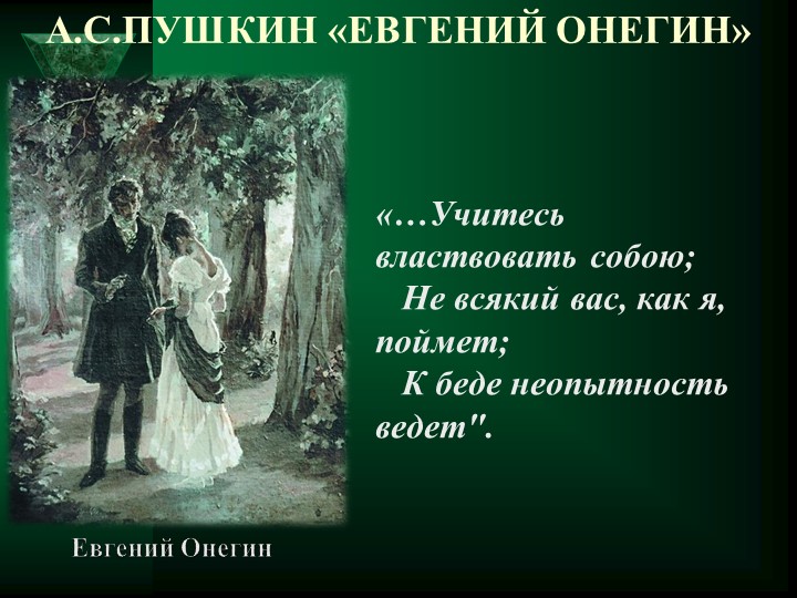 Теперь небольшой анализ любви Татьяны Лариной к Евгению Онегину. На мой взгляд, прекрасным образцом “недоступного” мужчины является Евгений Онегин из одноименного произведения Пушкина. Когда Онегин появляется в поместье Лариных, девушка влюбляется в него. Он самый настоящий “недоступный” мужчина. Классический случай.