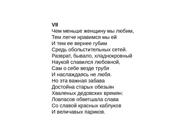 И, кстати, ту же мысль Пушкин выразил в письме к своему брату, Льву Сергеевичу: «Чем меньше любишь женщину, тем вернее овладеваешь ею. Но это удовольствие достойно старой обезьяны 18-го столетия». Комментарий здесь он сделал тот же.