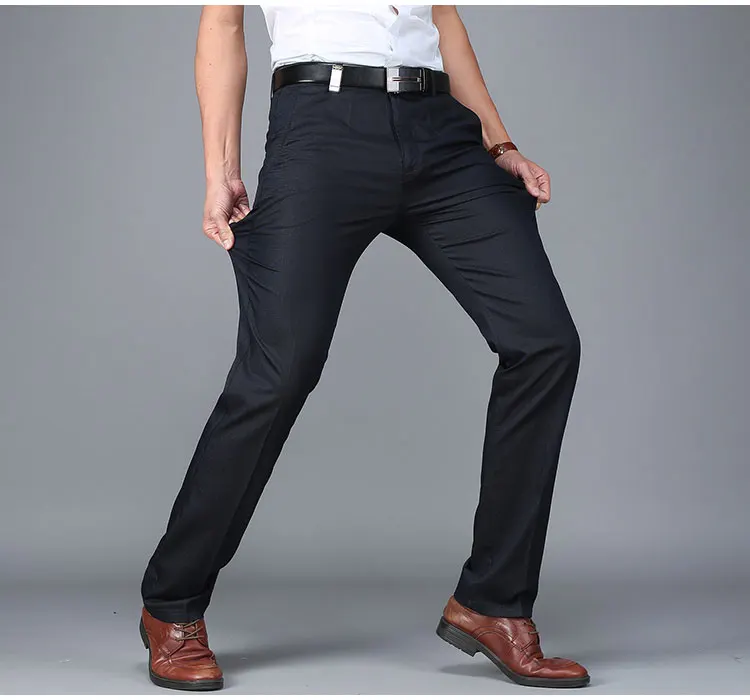 Для посещения офиса, торжественных случаев традиционные брюки идеальны. Они изготавливаются из однотонной ткани с синтетическими примесями, сохраняют презентабельный вид и не мнутся. Могут иметь спереди защипы, снизу – отвороты, что подходит для мужчин плотного телосложения. Обычно идут в комплекте с пиджаком, дополняются ремнем и подтяжками.