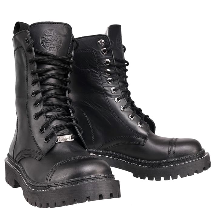 - Байкерские. Еще один тренд – модные ботинки в байкерском стиле. Их отличает массивная подошва с протекторами, высокое голенище и обильные украшения – пряжки, ремни, бляхи, заклепки.