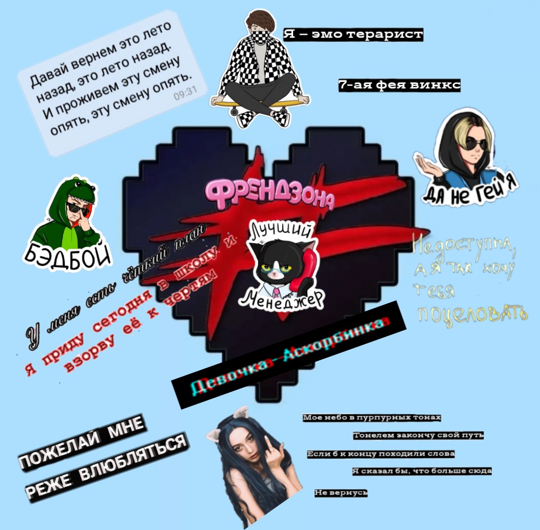 «Френдзона» — школьный поп-панк-коллектив из города N, пропитанный подростковыми грезами и запахом дешевых сигарет. Из этой френдзоны тебе не выбраться — мы тебя любим, но как друга». Этот текст висит на странице группы «Френдзона» в «ВКонтакте», насчитывающей почти 150 000 подписчиков.