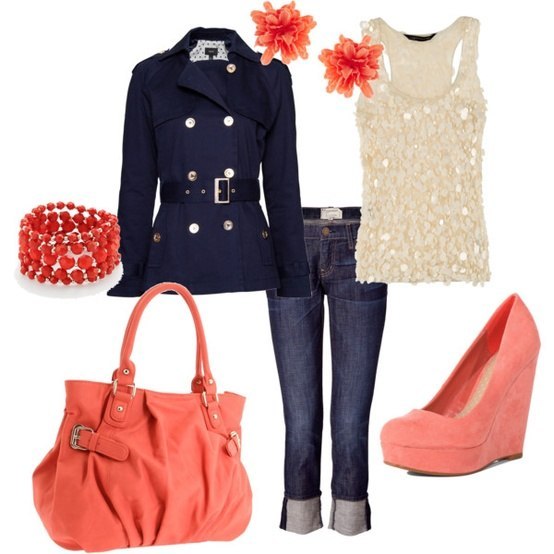 Попробуйте коралловый топ в сочетании с ярко-фиолетовой сумкой или туфлей и немного разбавьте его золотыми аксессуарами.