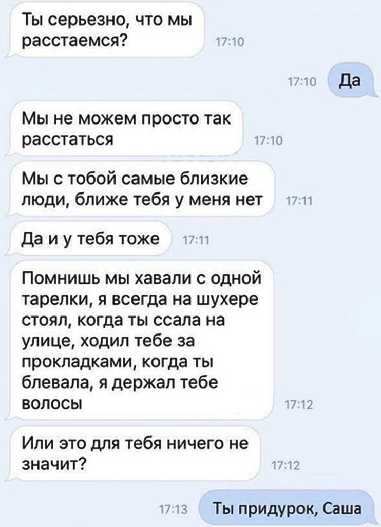 После всего времени, которое вы провели вместе, ваше сердце будет разбито, если вас бросят из-за смс. (Помните, когда все думали, что Зейн расстался с Перри из-за переписки? Не круто.) ту же любезность, которую вы хотели бы получить, и позвольте им закончить личным разговором. Если вы можете не расставаться по особому поводу — например, в праздник, день рождения или прямо перед их большим испытанием или игрой чемпионата — это самый добрый и самый внимательный вариант.