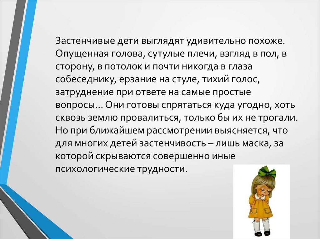 Их очень сложно вовлечь в общий разговор, общую деятельность, они избегают контакта с другими детьми. Конечно, эти дети не из тех, что радостно залезают на табуретку, чтобы прочесть стишок, их сложно уговорить на участие в детских утренниках, а каждый вызов к доске – это сильнейший стресс.