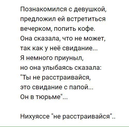 Приведем пример конкретного сценария для креативного предложения встречаться. Парень запланировал встречу с молодой особой для передачи книг на набережной и пришел в костюме с галстуком и бутоньеркой, что сразу насторожило девушку, вызвав ее любопытство и озадаченность. Не объясняя ничего, он передает ей плеер с наушниками и просит послушать музыку, включает романтичный трек и достает из книг стопку заготовленных листов, на которых своими руками написал признание и предложение встречаться, каждое слово отдельно на листе и с оформлением. Это выглядело мило, особенно на фоне его серьезного костюма. В конце он написал, что если она откажет – он прыгнет. Если согласится – тоже! И не дожидаясь ее ответа, буквально не дав ей опомниться, он прыгнул в воду в костюме и поплыл прочь.