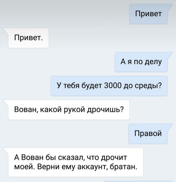 - «Привет! Увидел твой аватар в чате и решил тебе написать. Меня зовут Ваня, я юрист. Как твои дела?»