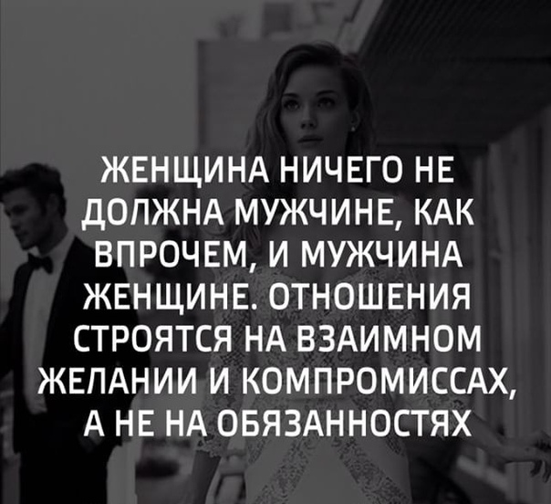 Многие люди имеют «интересное» мнение, которое звучит как «никто никому ничего не должен». Якобы то, что человек должен, прописано в Конституции. Звучит очень пафосно и не относится к любовным отношением. С такой точкой зрения в них действительно лучше не вступать. На самом деле, «должен» в этом контексте означает всего лишь завышенные ожидания, которым другой человек не обязан соответствовать.