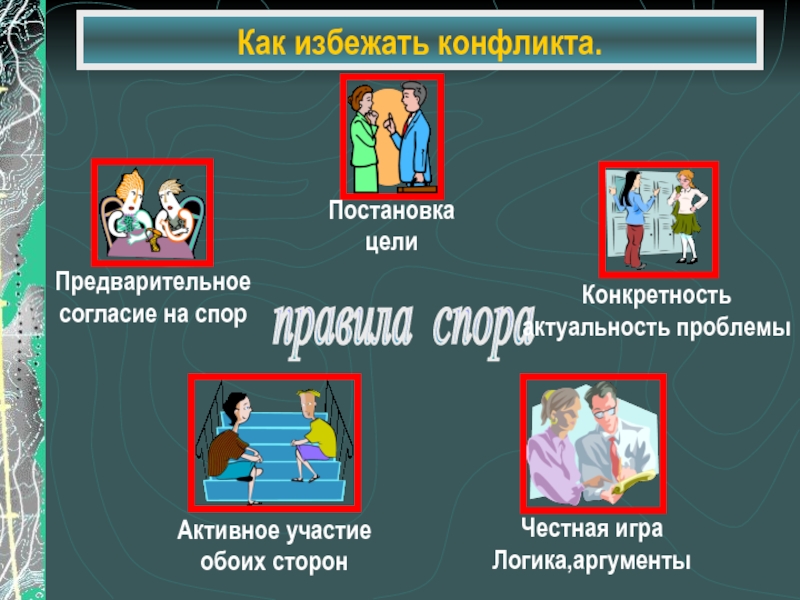Прежде всего, нужно задать себе вопрос: что может послужить источником конфликта? Получив приблизительный ответ, попытаться заранее устранить хотя бы часть побудительных причин.