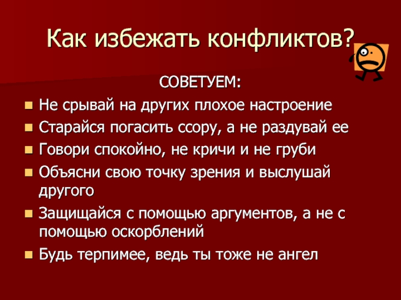 Навык избегания конфликтов позволяет в рамках своего личностного развития подняться на ступень выше. Неблагоприятные обстоятельства позволяют по-иному взглянуть на себя, других людей и жизнь в целом. А когда человек меняется сам, меняются и его отношения с окружающими.