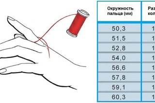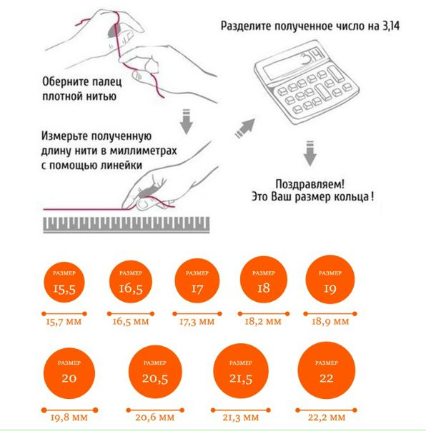 - В том случае, если у близкого вам человека нет подходящего кольца, которое можно было бы использовать в качестве эталона, попробуйте аккуратно измерить размер с помощью нитки. Необходимо выбрать плотную нить, намотать ее на нужный палец в четыре слоя и отметить место соединения концов. Нитка разматывается, полученный отрезок измеряется в миллиметрах и делится на 12,56. Полученное значение округляется в большую сторону. К примеру, если при измерении у вас получилось чисто 15.3, то размер составит 15.5, а значение 17.8 округляем до 18.