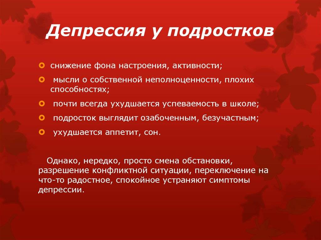 Наиболее распространены такие симптомы депрессии, как бессонница, чувство тревоги, опасения, постоянного страха, отчаяние, заниженная самооценка, апатия, невнимательность, чувство усталости, перемены настроения, равнодушие и безразличие ко всему, снижение аппетита. Иногда у людей, которым нужно лечение депрессии, возникают мысли о смерти, о самоубийстве. Часто бывают головные боли, боли в сердце, спине, дроже в теле, сухость во рту, запоры. В этих случаях депрессия может ошибочно расцениваться как проявление той или иной физической болезни (снижение веса- значит рак, боли в сердце — значит инфаркт).