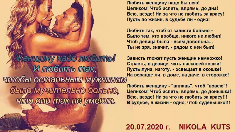 — Развивайте свою сексуальность и чувственность. Нежно касайтесь своего мужчины, ощущайте его всем своим существом, показывайте, как вы его хотите. Ведь почему мужчины уходят? Потому что чувствуют себя нежеланными, часто критикуемыми … Уходят к тем, кто их хвалит и любит. Будьте ласковой и желанной.