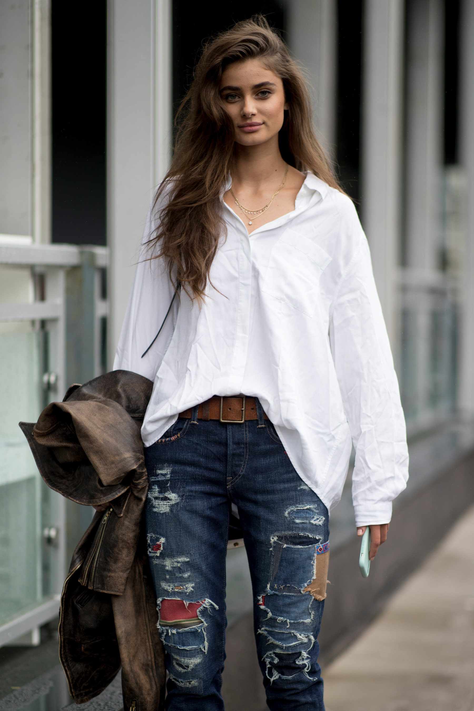 Белая рубашкаК классическому стилю, который уместен во всех случаях, стоит отнести белую рубашку с джинсами. Можно отправиться на работу или вечеринку. Очень многое зависит от покроя и длины рубашки. Короткую облегающую лучше носить под заправку, при этом модель желательно найти с высокой талией. Образ получится очень подтянутым и романтичным. Для джинсов лучше всего подходят рубашки простого кроя без украшений. Силуэт лучше прямой и немного свободный. Трендом сезона являются объемные белые рубашки с рукавами.
