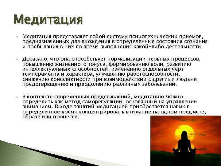 Медитация переводит ваш ум на совершенно иной уровень и порой трудно понять как будет работать ум на этом уровне, пока вы пребываете в том состоянии ума, в котором вы находитесь сейчас, без медитации.