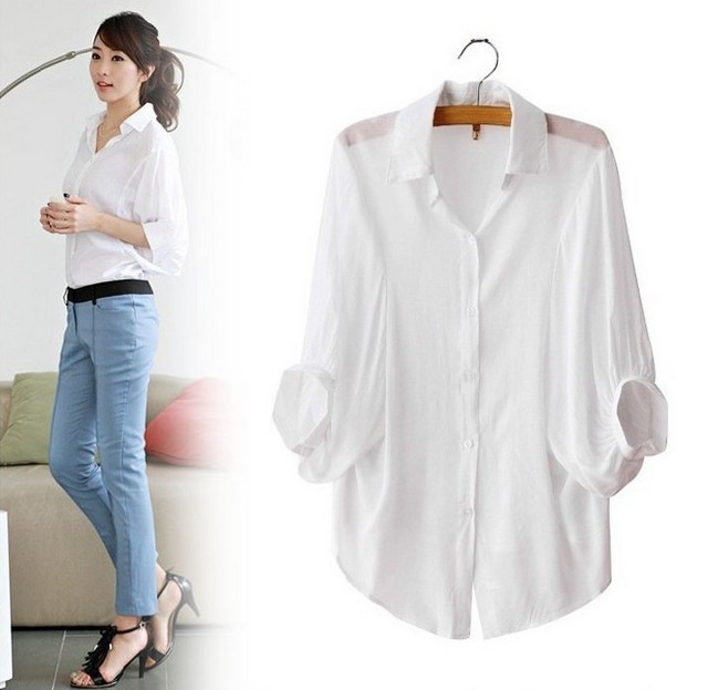 - Женская рубашка с длинным рукавом. Если она выполнена из тонкого материала, то такую рубашку можно спокойно надеть и летним вечером.