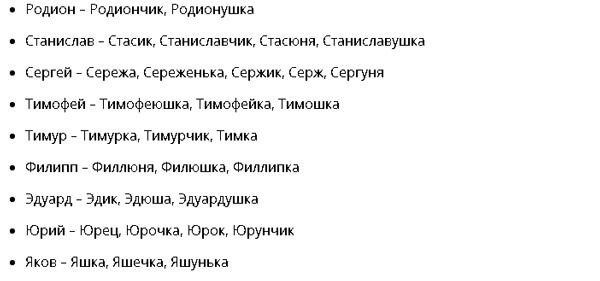 - Сергей: Сережик, Сергушка, Сергунька, Сергейка;
