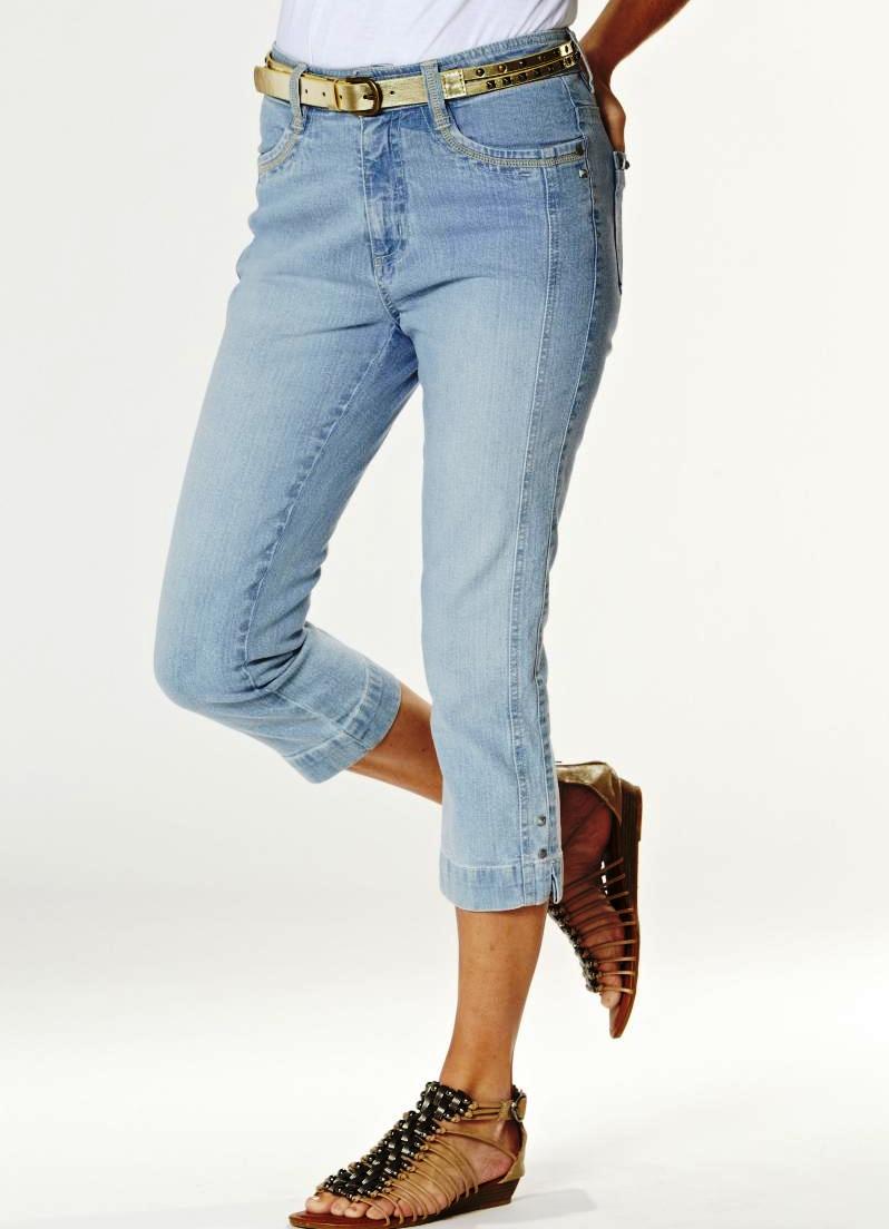 - Капри. Капри – это укороченные джинсы, длина которых опускается немного ниже середины икры. Эта модель укороченных джинсов напротив предназначена для визуальной коррекции женской фигуры. С помощью ношения капри можно визуально увеличить бедра и уменьшить талию, формируя безукоризненно красивый силуэт.