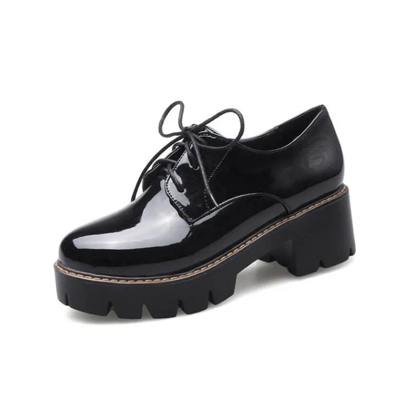 - Лакированные женские ботинки на толстой подошве. Самый лучший способ привлечь внимание окружающих к ногам – выбрать блестящую лакированную обувь. Преимущество такой обуви в том, что она смотрится более женственно и менее массивно.