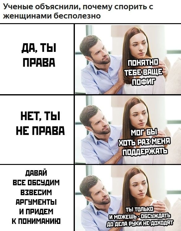 Или, что доказать неправоту девушки можно только в суде, и то при условии, что судьей будет мужчина. А кто-то может вспомнит французов, которые говорят: «Если мужчина знает, что женщина не права, он должен попросить у неё прощения.» Но, поверьте парню, который учится на факультете филологических див: доказать свою правоту можно и нужно.