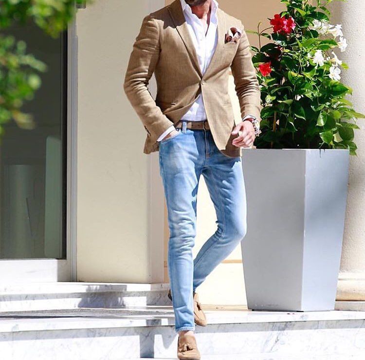 Мужские пиджаки под джинсы должны сочетаться с ними по цвету, то есть к темным джинсам надо подобрать темный пиджак, а к светлым – белый, голубой, бежевый, песочный. Ткань может быть теплой, твид или вельвет для зимы или лен, хлопок для жаркого времени года.