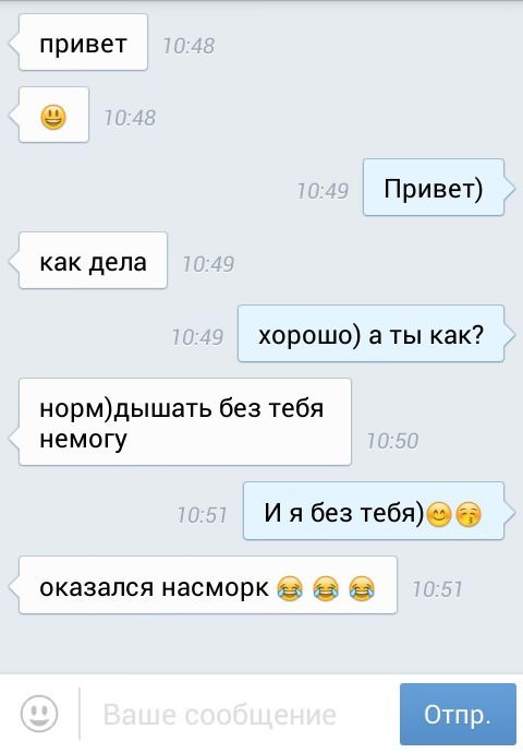 Напоминает диалог персонажей из компьютерной игры года эдак 2003-го. Сейчас с таким подходом шансы невелики, особенно если твоя избранница – действительно приятный собеседник и интересный человек. Избегай прерывистого общения. Писать «Привет» и думать час над тем, как продолжить разговор – заранее проигрышная стратегия.