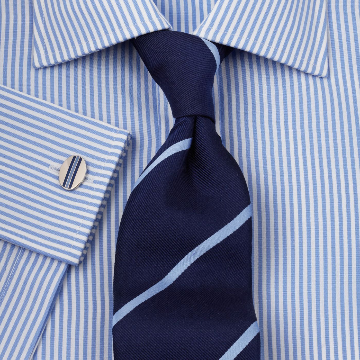Итальянский шелк, используемый для изготовления галстука, с первого взгляда демонстрирует лихую элегантность. Серебряные, темно-синие и золотые полосы — блестящее сочетание цветов для галстука.