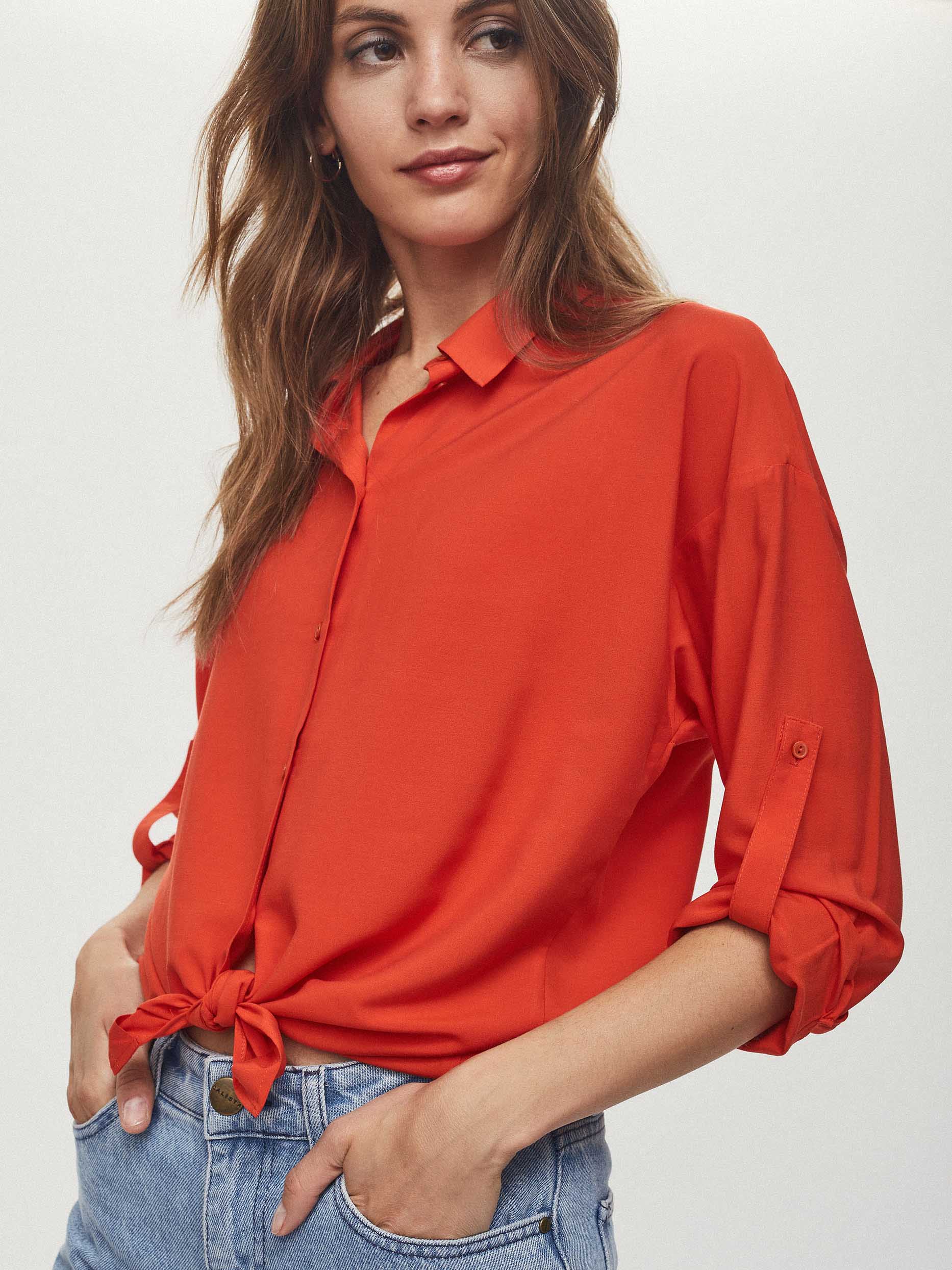 Попробуйте надеть на рубашку черный топ бандо. Это стильный и очень легкий прием. Обратите внимание на важные детали: рубашку необходимо заправить с одного края (где пришиты пуговицы), подвернуть рукава, поднять воротник. Пуговицы на рубашке лучше расстегнуть до начала топа.