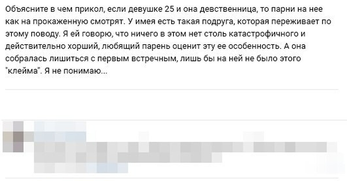 «Если бы я встречался с кем-то и оказалось, что она девственница, я был бы удивлен, но не осуждал бы это, — говорит 26-летний Марк. сидите прямо со мной. Это потрепанно и заставляет меня думать о грубых стариках, которые не могут быть рядом с женщинами их возраста».