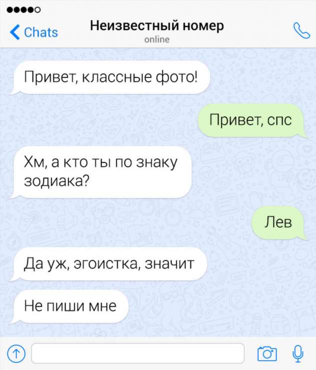 «Девушка, твоей маме зять не нужен?» Подобные вещи уже настолько изжили себя, что вы только оттолкнёте человека ещё дальше. Самое страшное — он подумает, что вы здесь отрабатываете практику после пикап-курсов для лузеров, выполняя дурацкие задания, вроде «собрать 100 номеров девушек за один вечер». Собственно, если вы девушка, то топ-подобных фраз должен быть вам итак знаком. Разве кто-то из вас уже на такое ведётся? Искренность всегда лучше глупых подкатов. Лучше подойдите и честно признайтесь, что вам просто понравился человек.
