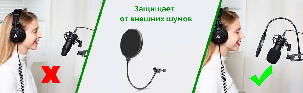 Поп-фильтр очень полезен для минимизации взрывных звуков при разговоре. Это резкие звуки, которые ваш рот издает в микрофон, когда произносит звуки «П» и «Б». Вы можете найти все виды поп-фильтров, которые подходят для вашей индивидуальной настройки. Вот металлический поп-фильтр, а вот традиционный нейлоновый.