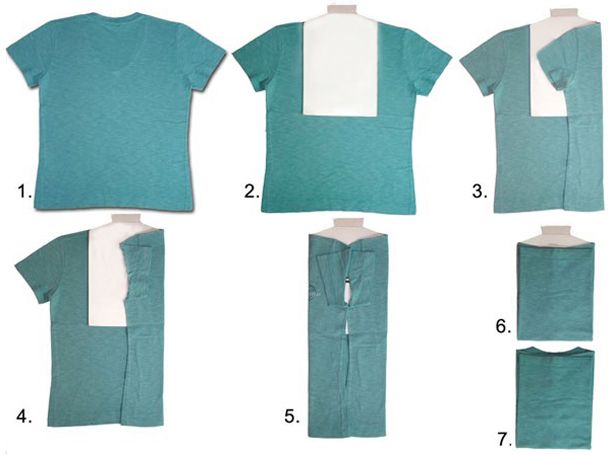 Сложите одну сторону рубашки к центру, затем отогните короткий рукав назад в другом направлении. Сложите воротник рубашки обратно к нижней кромке, чтобы получился прямоугольник. Сложите рубашку еще раз пополам. Храните сложенную футболку в вертикальном положении.