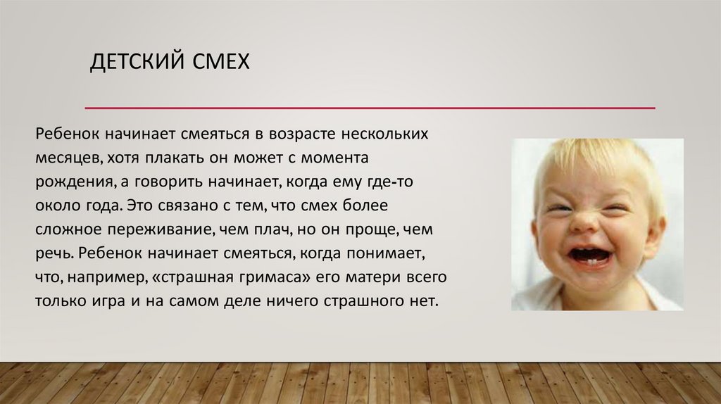 Смеяться малыши начинают задолго до того, как научатся говорить. Каждый ребенок проходит свой путь от первой улыбки к первому смеху, который чаще отмечается в возрасте 3—5 месяцев. Однако бывает, что малыш начинает заливисто смеяться только к году жизни. Громким смехом дети обычно копируют поведение родителей: наблюдая за хохочущими взрослыми, начинают подражать.