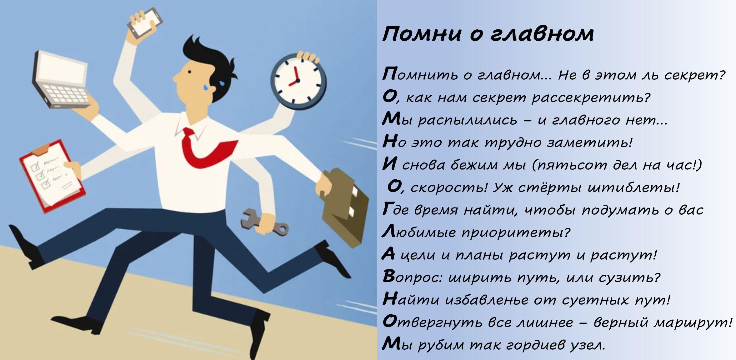Так что, друзья, стремясь переделать все дела, обязательно помните об ограниченности времени и своих возможностях и не верьте популярным веяниям. Вы никак не сможете успеть всё. Но это вовсе не значит, что вы не можете успеть главного!