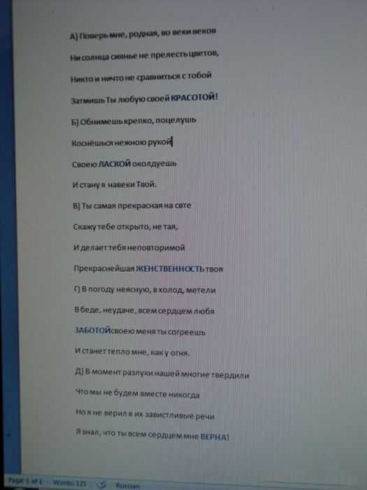 Цветов много, в смысле не 1, значит и стихов много и чтобы не рвать 1 стих на части, сделаем разные 4-ростишья. Я решил выделить ими 5 основных достоинств своей девушки, это: Красота, Ласка, Женственность, Забота и Верность. И сочинил (хвастаюсь — сам) про каждое качество по маленькому стишку, которые прикладываю в этом фото (фоткал с монитора, не пинайте). Авторские права не накладываю, если кто то решит их использовать, мне наоборот будет приятно что мои стишки кому то пригодились