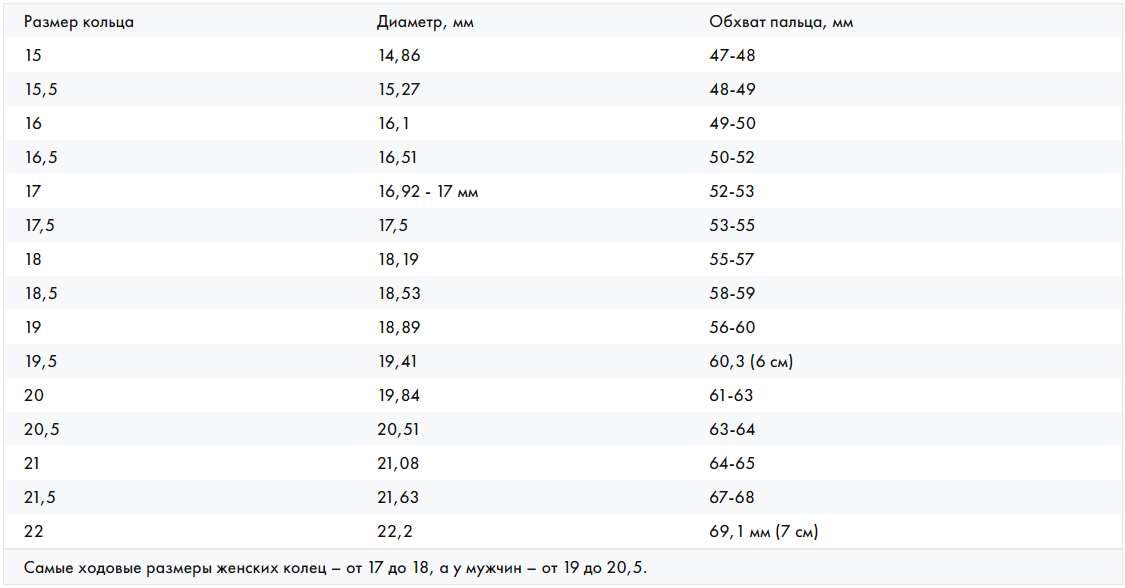 - Самый распространенный размер кольца для женщин — от 6 до 6,5.
