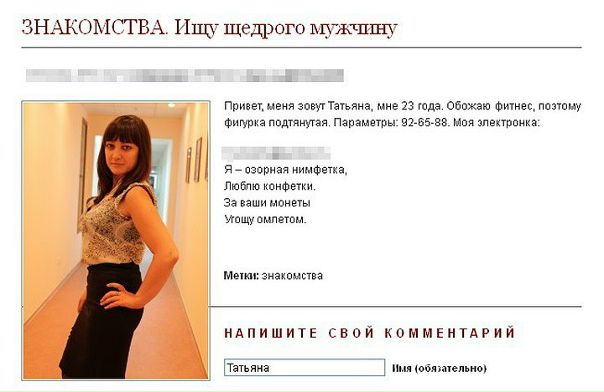 Здесь стоит очень аккуратно выбирать, ведь фотография легко корректируется в фотошопе, а написать ложные данные в анкету не составляет большого труда. Отсюда вывод – не стоит влюбляться в идеально составленную анкету. Сперва стоит обстоятельно пообщаться с её хозяином.