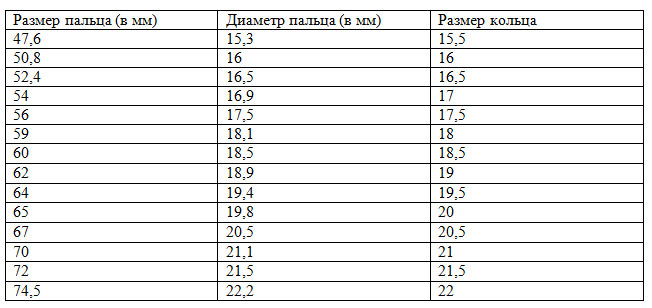 Существует несколько таких измерительных способов. Наиболее точным считается измерение путем полоски бумаги окружности пальца. Размер измерительного предмета должен составлять примерно 12 см на 3 мм, где первый показатель длина полоски, а второй — ее ширина. С помощью бумажного лоскута измеряют обхват пальца в нескольких местах: у основания, между основанием и средней фалангой, среднюю фалангу, чуть выше фаланги. Из полученных данных нужно вычислить усредненный показатель, который и будет верным. Не ошибиться с размером поможет ниже представленная таблица, по которой можно соотнести окружность и диаметр пальца с необходимым размером кольца.