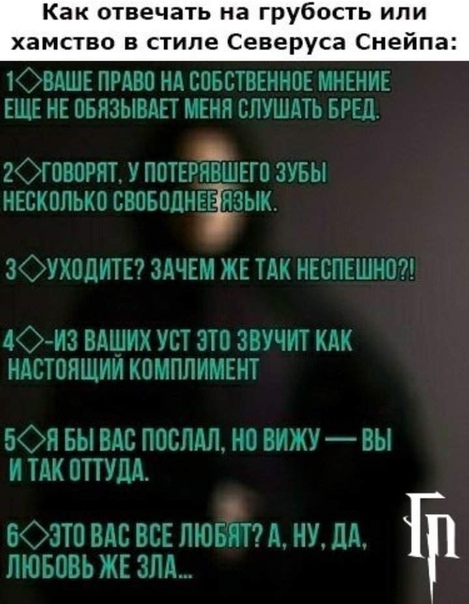 * Если вы попали в ситуацию, когда ответить обидчику просто необходимо, или вас душит желание это сделать, не бросайтесь на него. Главное быть спокойным, холодным в словах и выражениях. Глушить оскорбления желательно остроумными репликами и только после того, как собеседник закончил свой монолог.